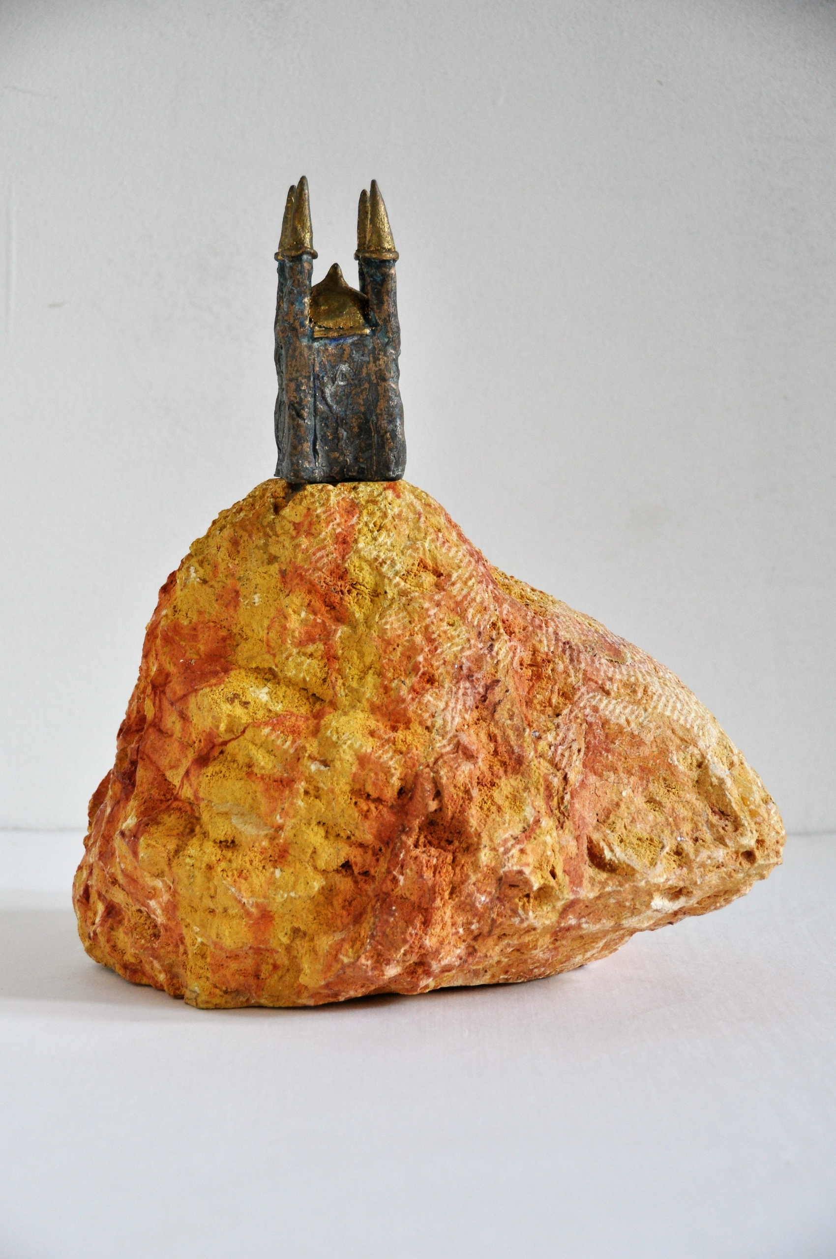 Formaat: 40 x 45 x 38 cm Materiaal: steen, brons, bladgoud